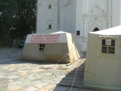 Вообще, эта традиция возведения в неожиданных местах скромных и аскетичных “палаточных церквей” на фоне массовой постройки настоящих храмов с подземными паркингами, гостиницами и спортзалами очень хорошо характеризует Московский Патриархат. Церковь ориентируется одновременно на все аудитории: как на “солидных господ”, так и на безумных маргиналов, посвящающих всю свою жизнь борьбе с идентификационными номерами и мировым жидомасонством. Люди наподобие Олега Сирко из-под Верховной Рады, или черниговских противников Киевского Патриархата – это в своём роде авангард, они говорят и делают те вещи, на которые официальная церковь не отваживается. Но при этом получают мощное прикрытие с тыла и имеют все преференции, которые есть у более цивилизованных священников. Когда такие же точно палаточные верующие занимаются ксенофобией и антисемитизмом или там под лозунгом “православие или смерть!” оскорбляют и бьют верующих других церквей, Патриархия предпочитает этого не замечать, обыватель же воспринимает таких людей не как часть Церкви, а как автономных фриков. Но стоит подпалить попу бороду – на его защиту сразу же поднимется вся церковная махина.