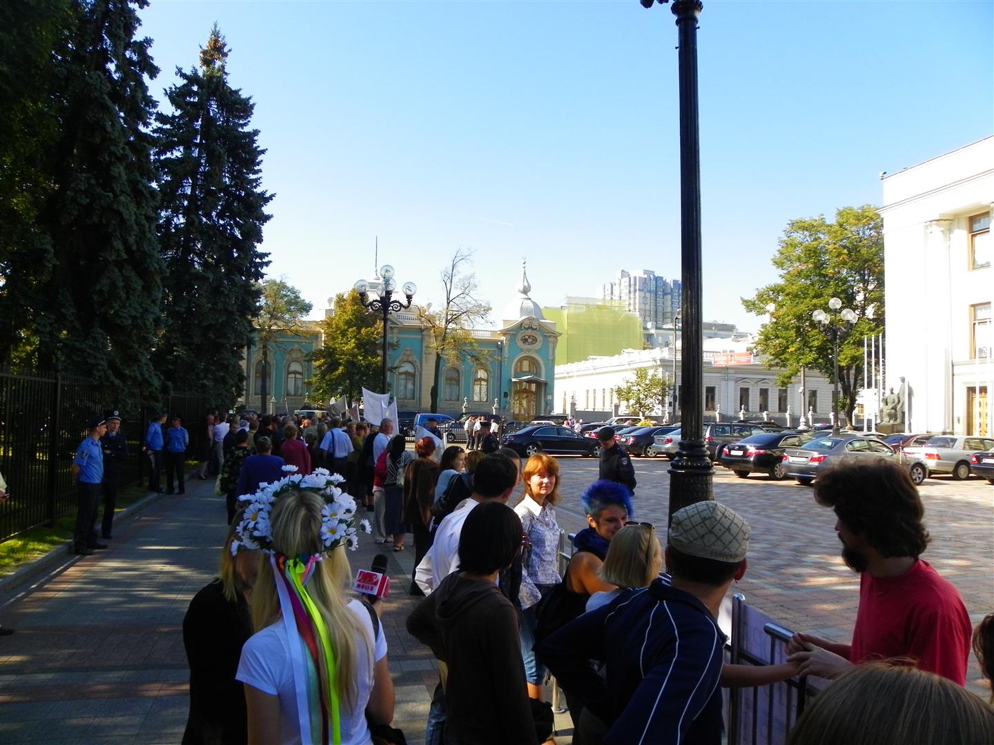 Пётр Онищенко отказался допустить нас к Верховной Раде на основании того, что мы не подали заявку, хотя подали мы её ещё за день. Когда милиционер звонил в мэрию узнать входящий номер – ему говорили, что никакой заявки нет, когда позвонили мы – она тотчас же нашлась. Но товарищ майор придумал новый повод не допускать нас к Раде – якобы заявка подана незаблаговременно (при том, что в законе срок подачи не оговаривается в принципе, и акция легитимна даже если уведомление отправлено телеграммой за минуту до её начала). Но в конце-концов Онищенко всё-таки признался, что всё дело в наших “неправильных” лозунгах, которые он считает “провокационными”. После того как к нам присоединился правозащитник Владимир Чемерис, незначительная часть активистов всё-таки прорвались к Верховной Раде, где шумела ещё пара митингов. Но сделать что-то серьёзное в окружении Беркута при оставшейся численности мы уже не могли. Стали отдельно, развернули свои плакаты, покричали в мегафон требования. Ближе к концу акции подбежал товарищ Каменев и предложил зарядить