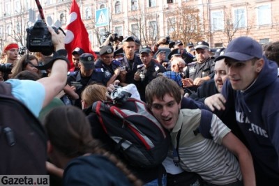 С Михайловской площади мы перебазировались на Софиевскую, где у нас тоже была подана заявка на идентичную акцию, которую суд попросту забыл запретить. Там и прошла официальная часть форума, прошла, впрочем, несколько скомкано – информационные стенды оказались захвачены Беркутом, дистро и аудиоаппаратуру удалось спасти (в ходе спасения, собственно, и началась драка).