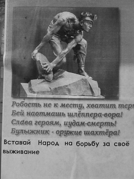 Революция, хули. Группа неизвестных наклеила листовку с призывом к восстанию. Листовку наклеила, понимаете? Группа неизвестных. Сообщил об этом Александр Данилюк, лидер движения “Спільна Справа”. Александр Данилюк он такой, он хуйни не сообщит. Если уж Александр Данилюк сообщил, что группа неизвестных наклеила листовку, это значит, что группа неизвестных действительно наклеила листовку. Уникальное событие в украинской политической жизни. Впервые в истории современной Украины (и тем более, впервые в истории Донбасса) группа неизвестных собралась вместе, взяла бумагу, взяла клей, взяла стихи барда-черносотенца, соединила всё это воедино и получила листовку, рвущую сердца простого люда, листовку зовущую в бой, листовку поднимающую на борьбу. А потом, не боясь репрессий, эту листовку наклеила, чем разожгла пламя борьбы в сердцах простых граждан. Антинародный режим бьётся в конвульсиях. Освобождённая брусчатка жаждет крови. Янукович переоделся в женское платье и, ломая ногти, роет туннель в Северную Корею, не зная, что Ким Чен Ир мёртв и надежда умерла вместе с ним.