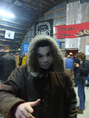Диванный анархист Александр Володарский во Франкфурте. Тут плохо понятно, но вокруг демонстрация на 6000 человек и мы как раз заблокированы полицией. Периодически взрываются петарды, летают бутылки и фаера. И тут внезапно я нахожу диван. Не фотошоп.