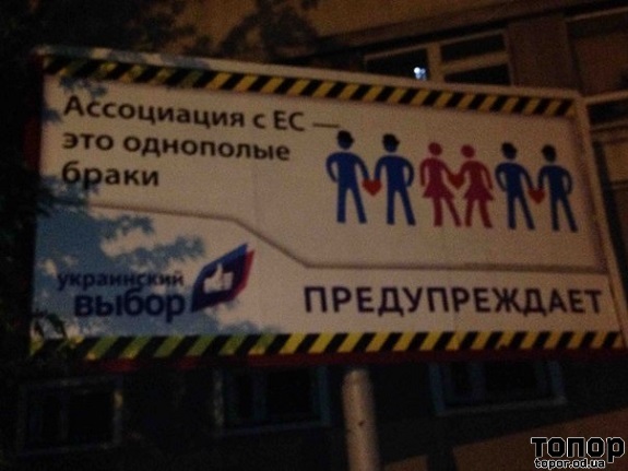 На улицах по всей стране появилась реклама-предостережение от “Украинского Выбора” Медведчука: “Ассоциация с ЕС – это однополые браки”.
