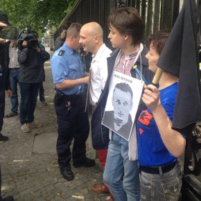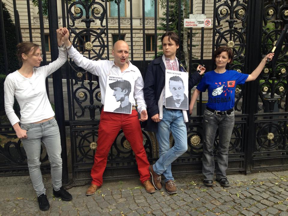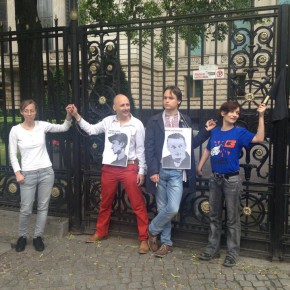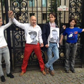 К российскому консульству в Берлине приковались анархист и режиссёр в знак солидарности со своими товарищами, арестованными в Крыму. Илья Рывкин и Кристиан Жереги поддержали Александра Кольченко и Олега Сенцова против которых сейчас сфабриковано уголовное дело. Лживая пропаганда объявила анархиста и антифашиста Кольченко и известного режиссёра либеральных взглядов в принадлежности к “правому сектору”, им инкриминируется дело о терроризме и угрожают огромные сроки.